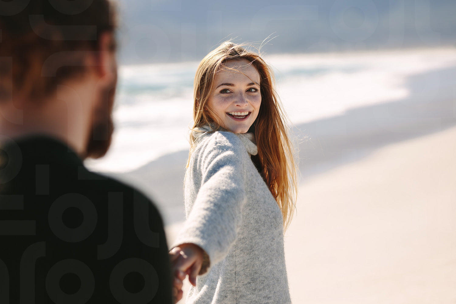 Beautiful young woman holding hand of her boyfriend and walking along the seashore. Couple strolling on the beach holding hands.
