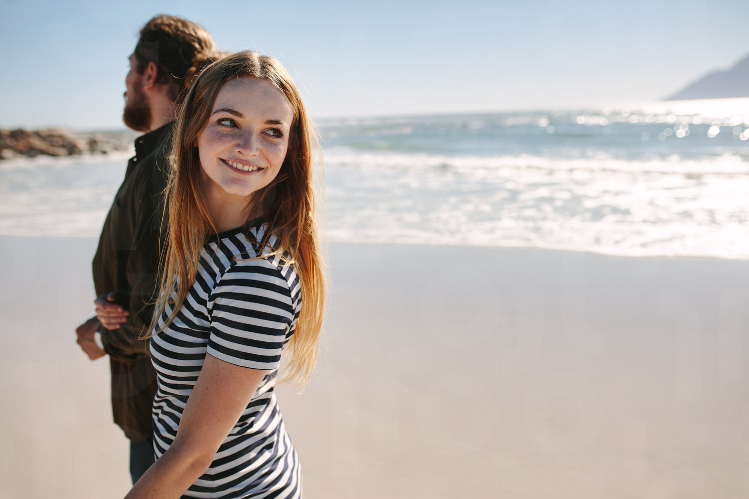 Pretty young woman looking back and smiling while walking on the beach with her boyfriend. Young couple on the sea shore.