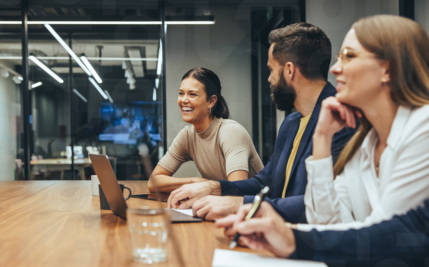 Happy businesswoman laughing while leading a meeting with her colleagues. Group of diverse businesspeople working together in a modern workplace. Business colleagues collaborating on a project.