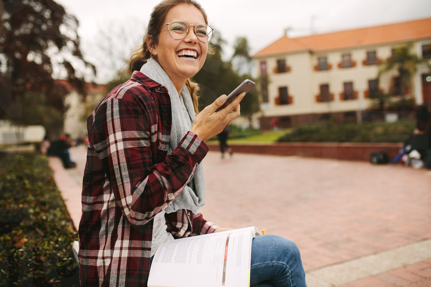 Smiling girl student sitting at university campus with book talking on mobile phone. Female university student using phone at campus.