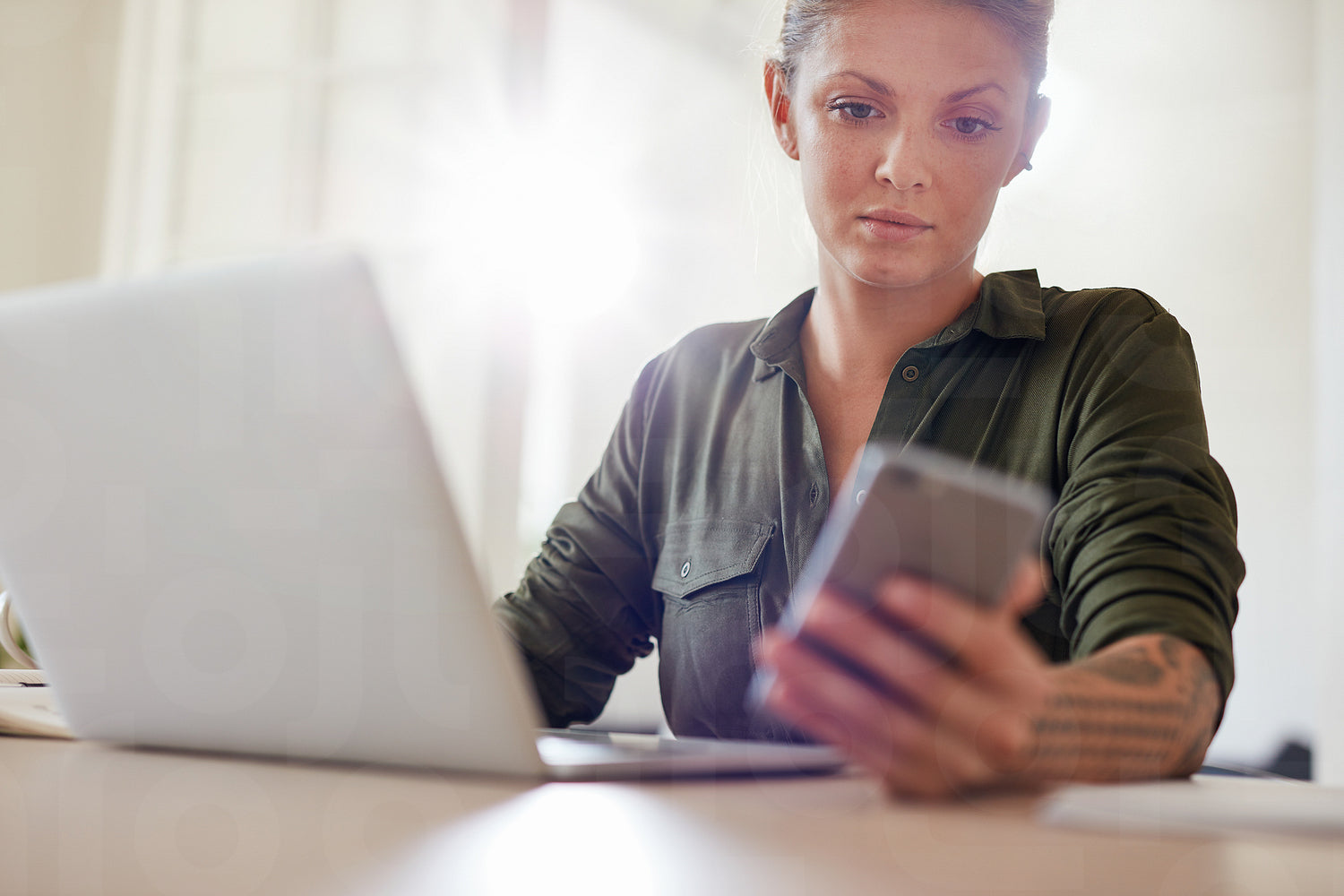 Shot of attractive young woman sitting at table with laptop and reading text message on his mobile phone