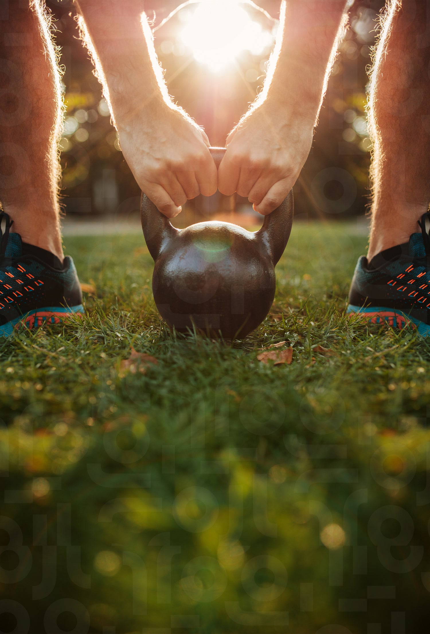Cropped shot of young man doing kettlebell workout, focus on hands holding kettle bell on grass.