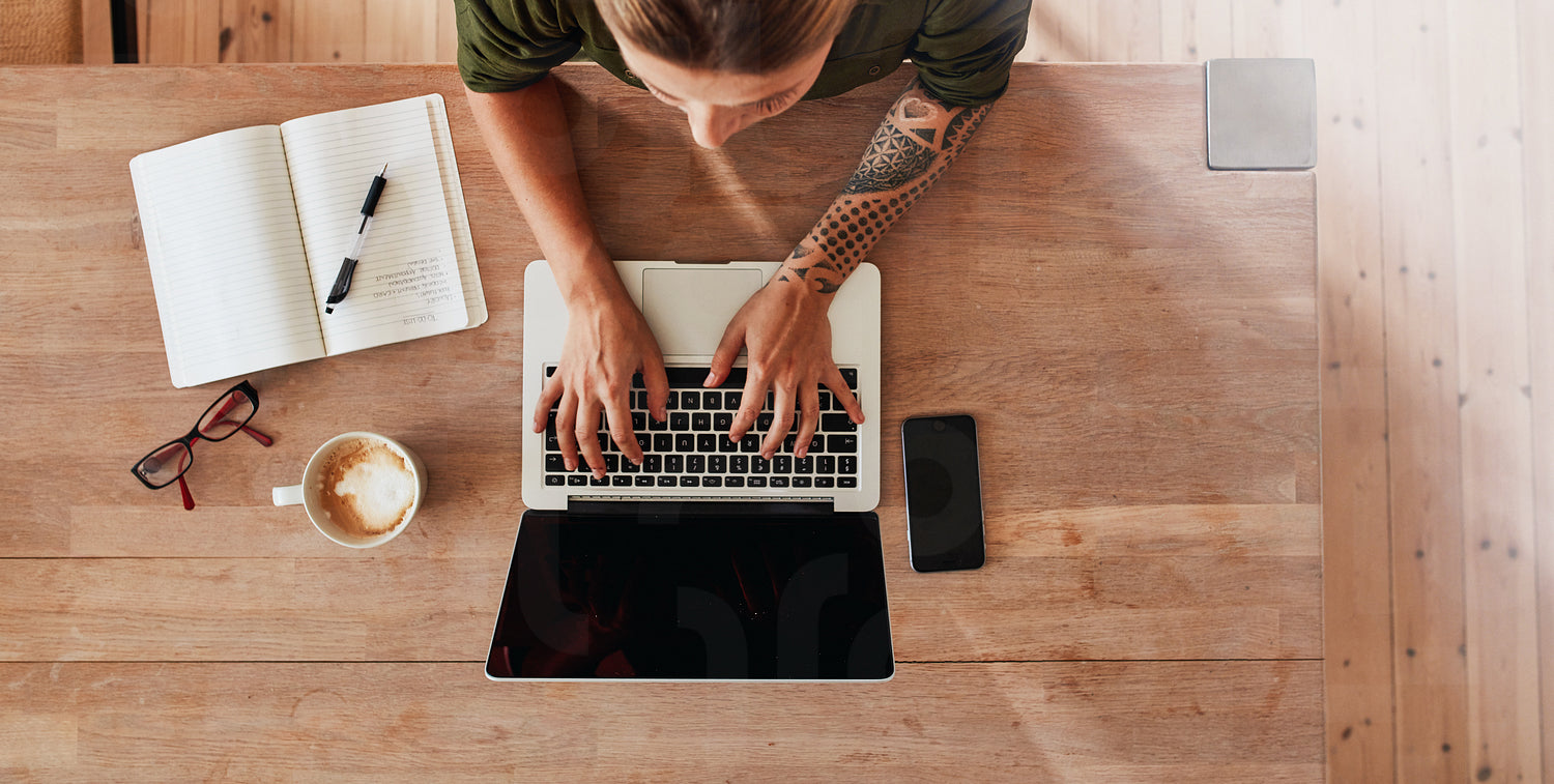 Top view of woman hands typing on laptop. Female sitting at cafe table with laptop, mobile phone, diary, coffee cup and glasses.
