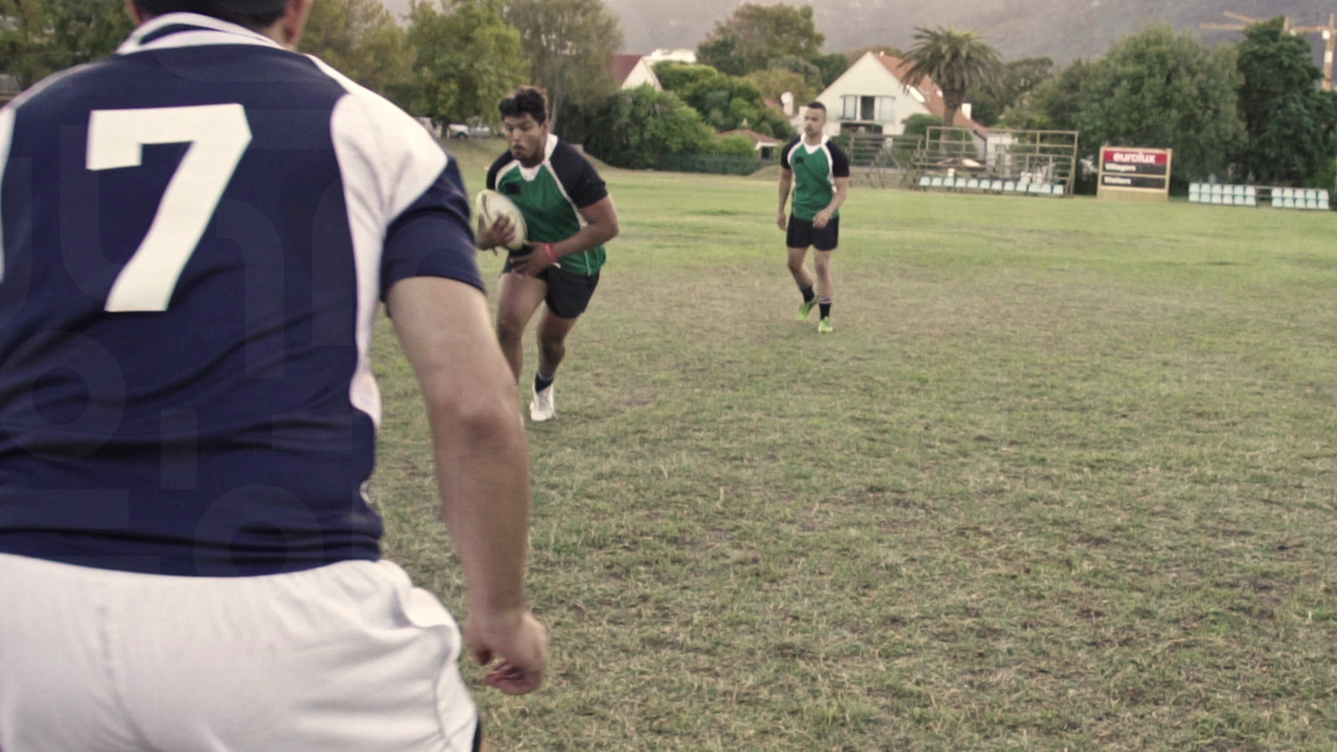 Rugby players tackling for ball possession during the match. Young men playing intense game of rugby.