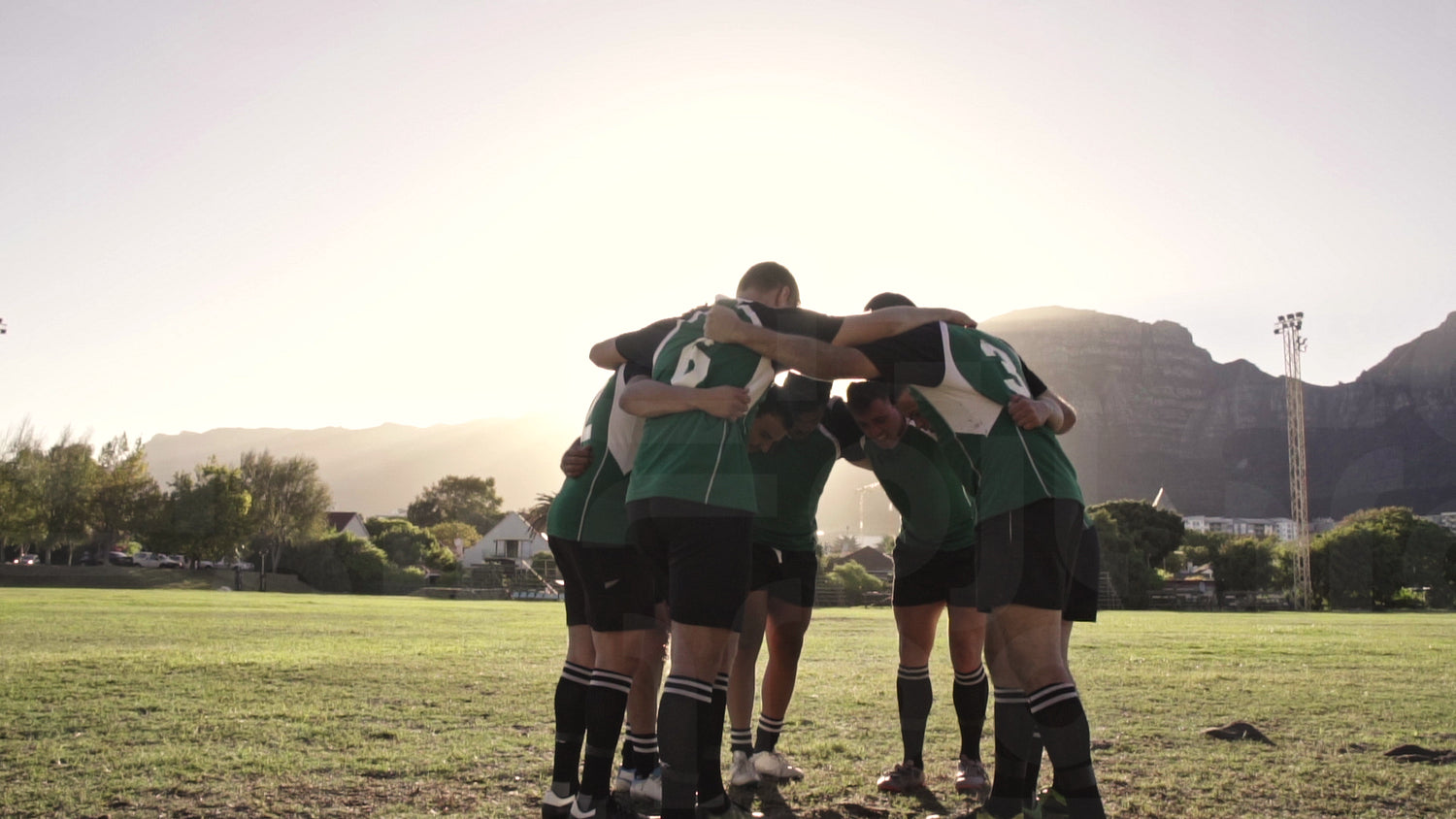 Group of rugby players performing a war cry before the match. Rugby team standing in a huddle doing their war cry.
