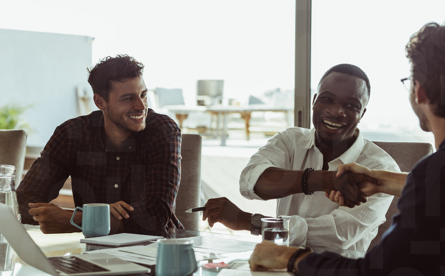 Businessmen discussing work sitting at conference table in office. Men shaking hands and smiling during a business meeting.