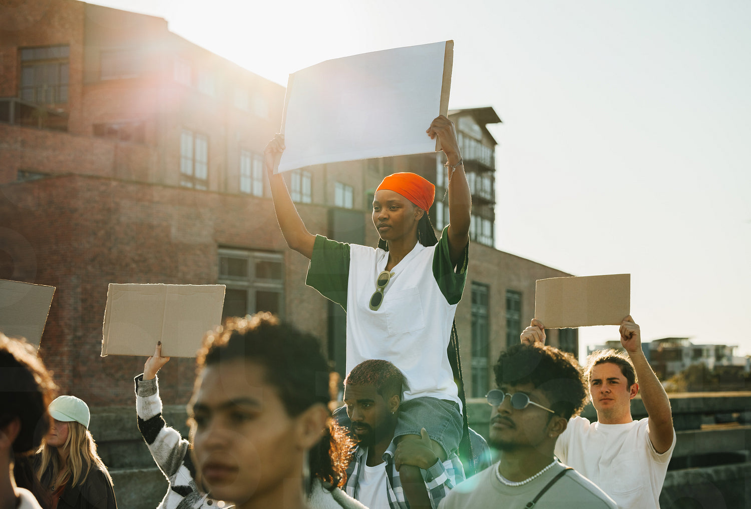 A diverse group of young adults gathered outdoors holding cardboard signs, representing peaceful activism and social justice advocacy within an urban setting.