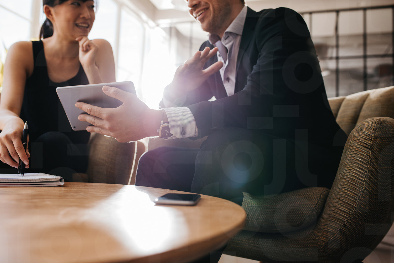 Cropped shot of business professionals having a meeting in office lobby using digital tablet. Business partners using touchscreen computer for project discussion.