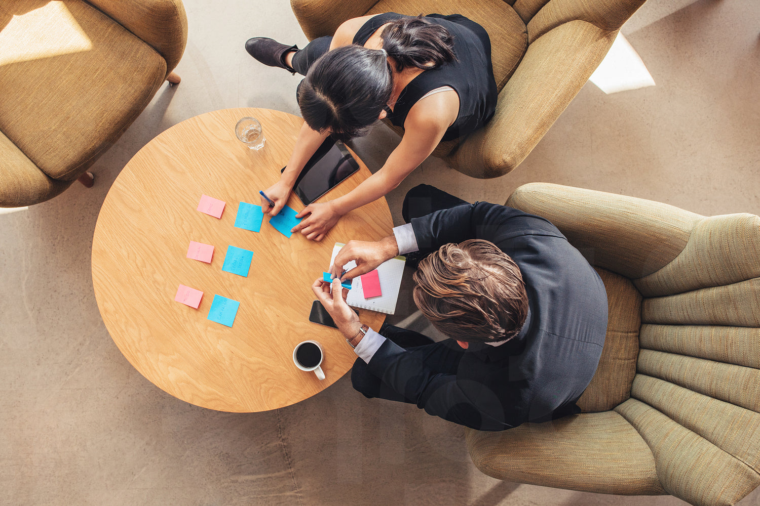 Top view of businessman and businesswoman discussing over adhesive notes on table in office lobby. Businesspeople preparing post it notes.