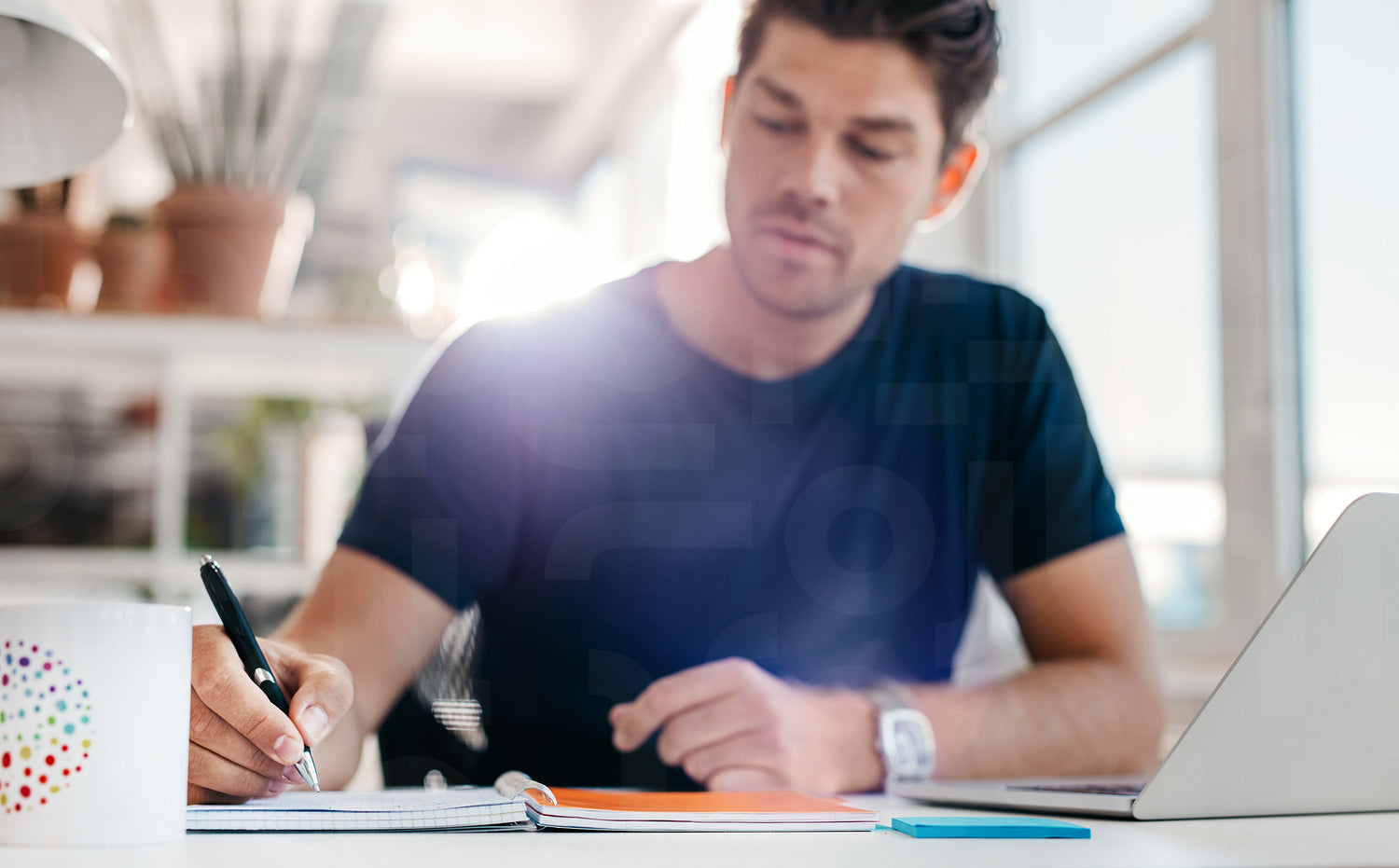 Shot of young man sitting at desk writing notes. Businessman working at his desk, with focus on hand.
