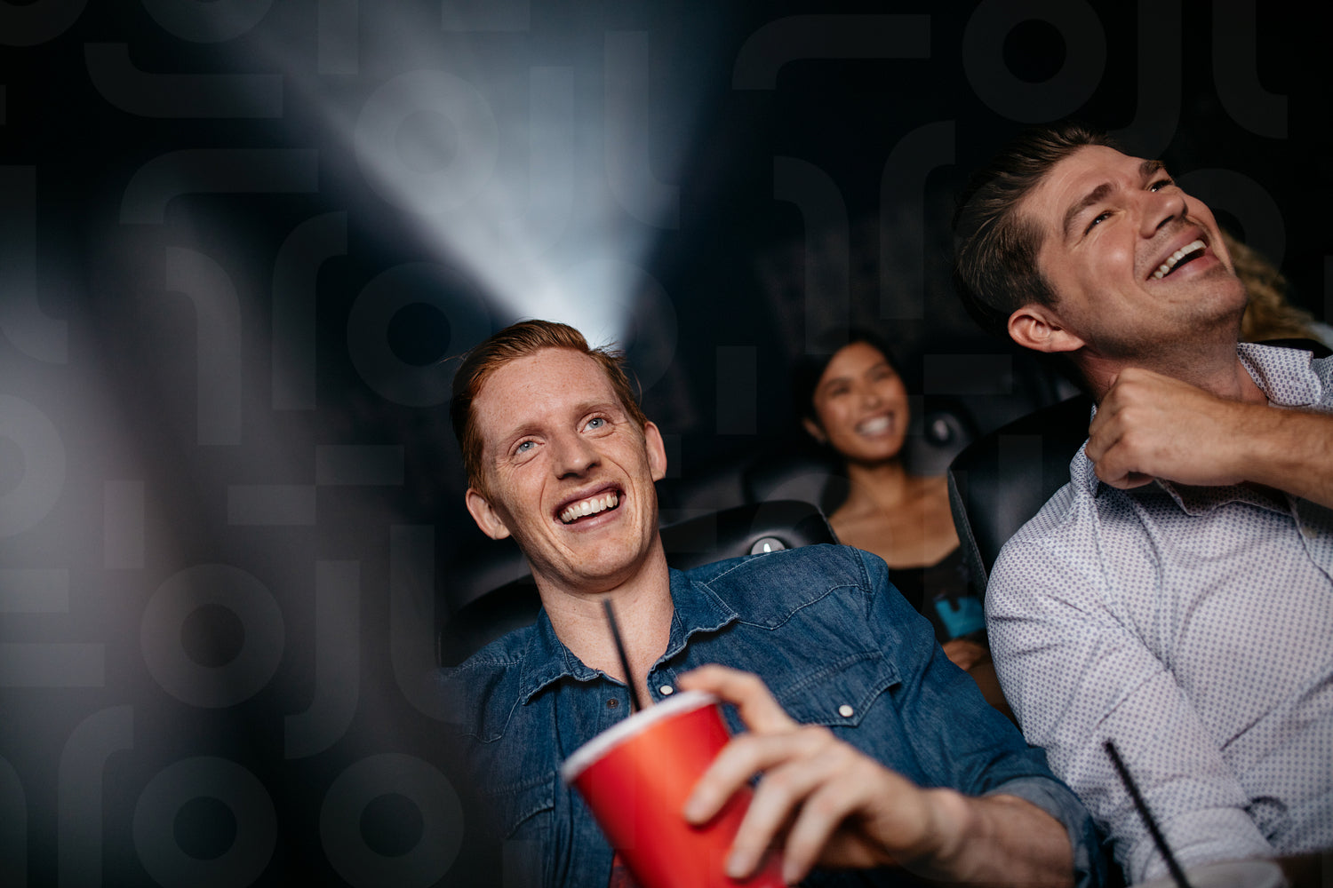 Young men watching movie in cinema. People in theater with drinks watching film.