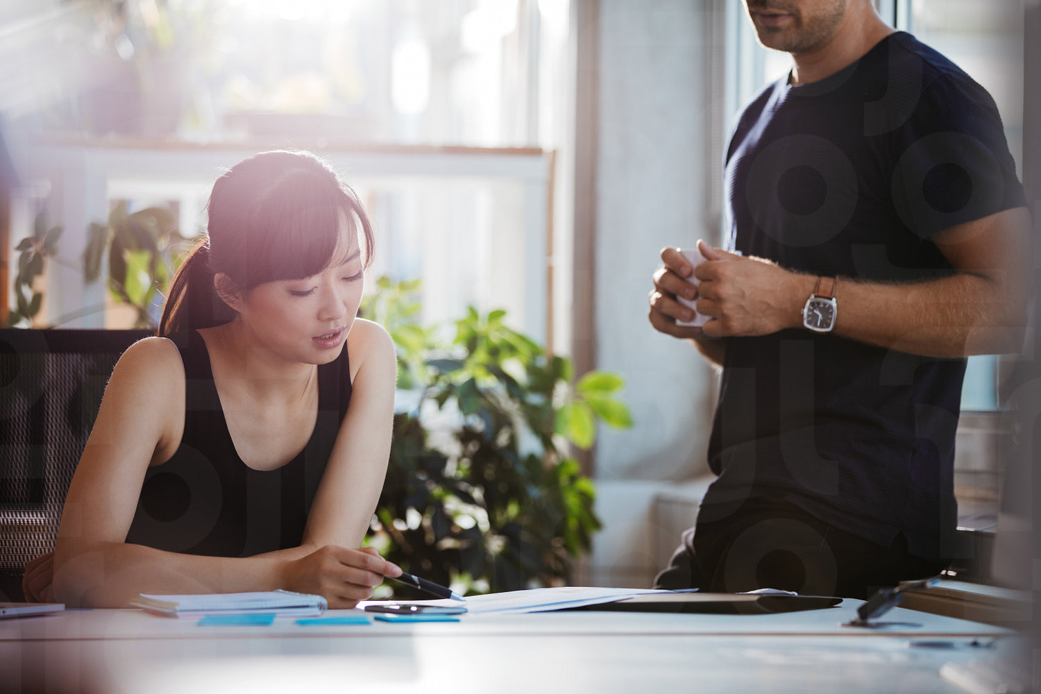 Shot of two young business partners discussing new ideas in office. Young people working together on new business project.