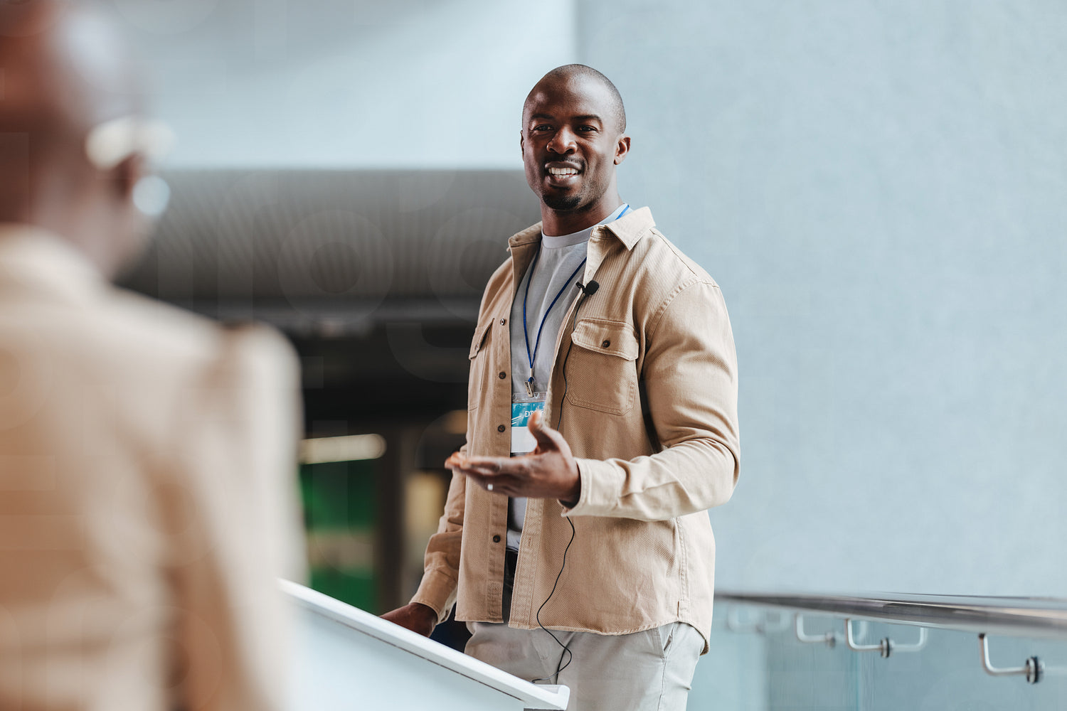 Professional African male speaker standing at a podium, engaging the audience during a corporate seminar, conveying confidence and expertise in a modern conference setting.