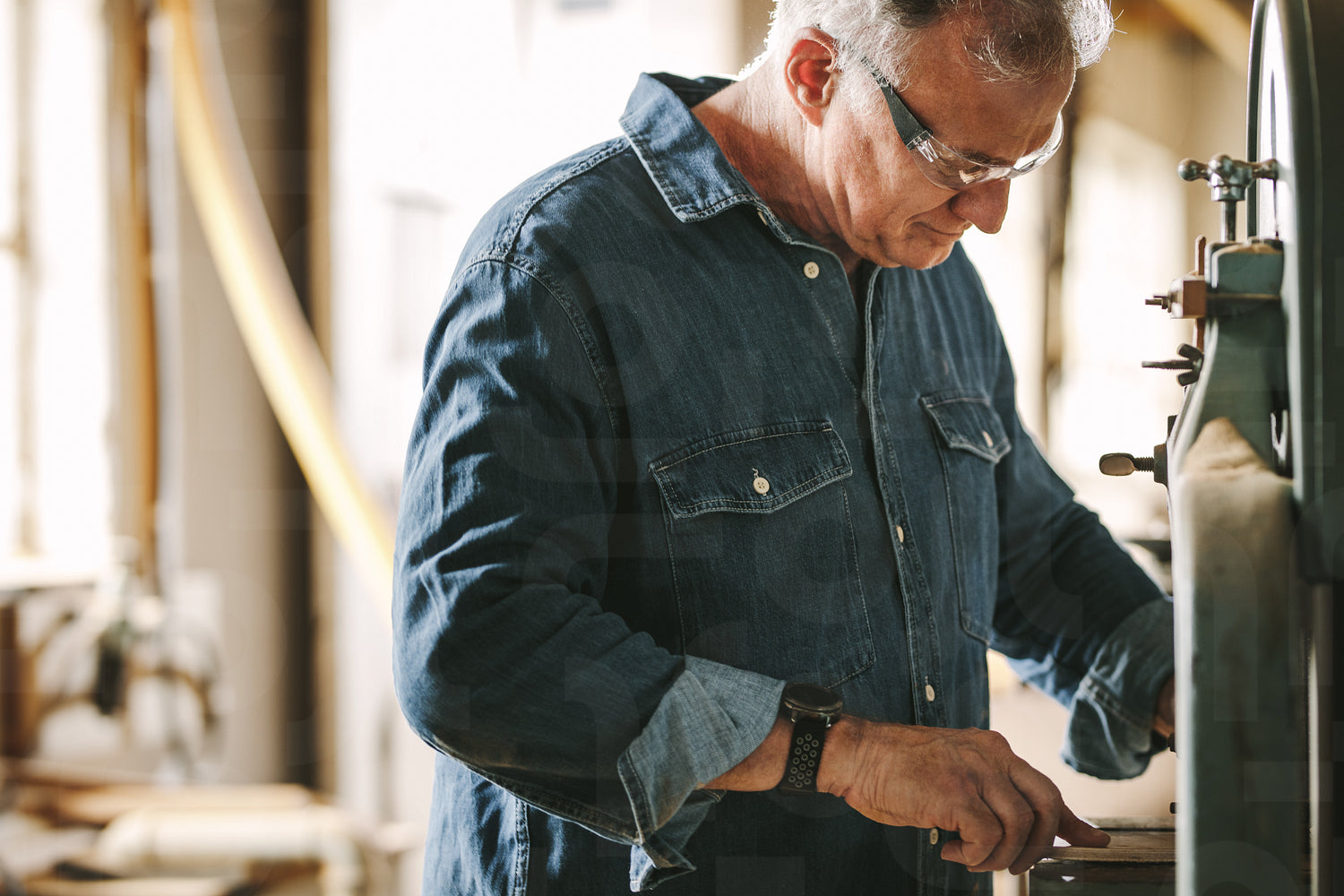 Mature male carpentry worker working in his workshop. Carpenter cutting wood on band saw machine at workshop.