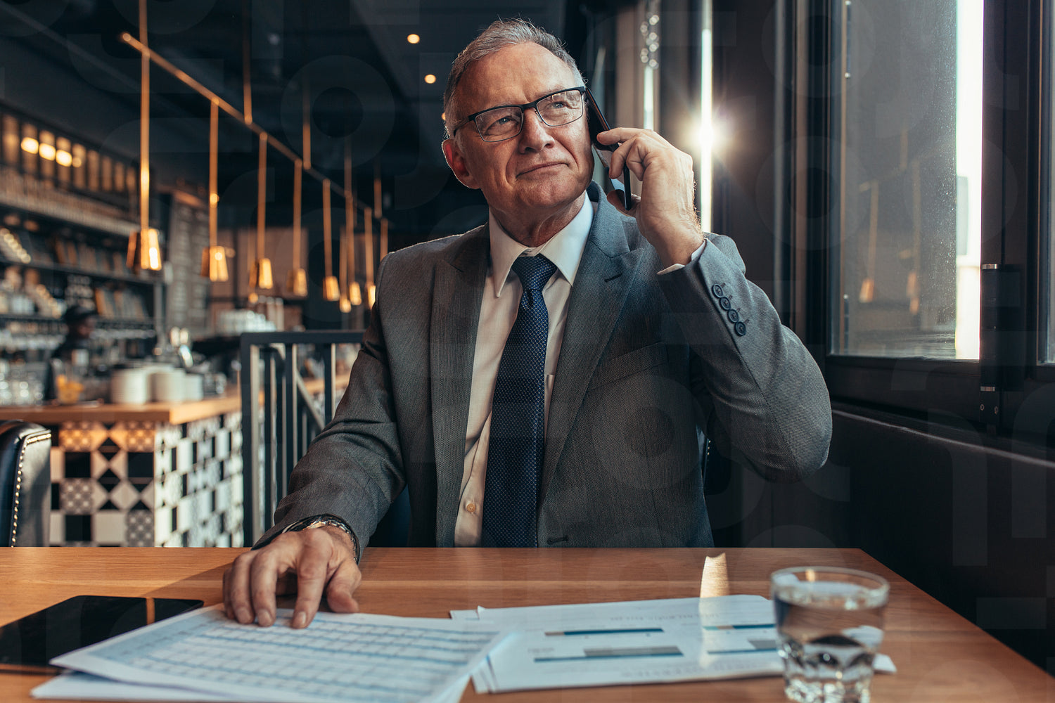 Confident senior businessman at coffee shop making a phone call. Mature businessman talking on mobile phone from a modern coffee shop with documents on table.