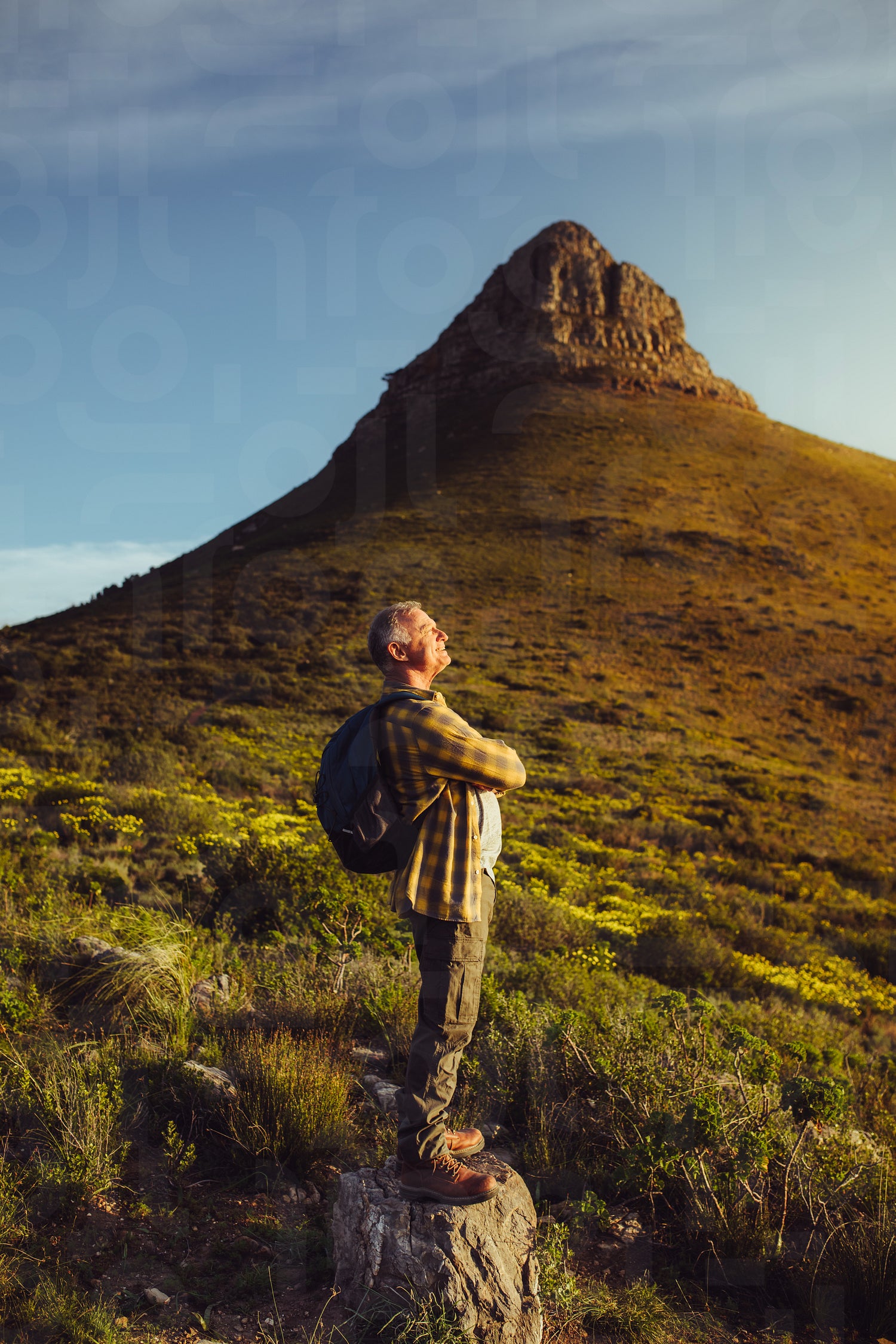 Senior man standing on a stone near a hill wearing a backpack enjoying the view. Side view of a hiker standing at the foot of a hill with folded hands.