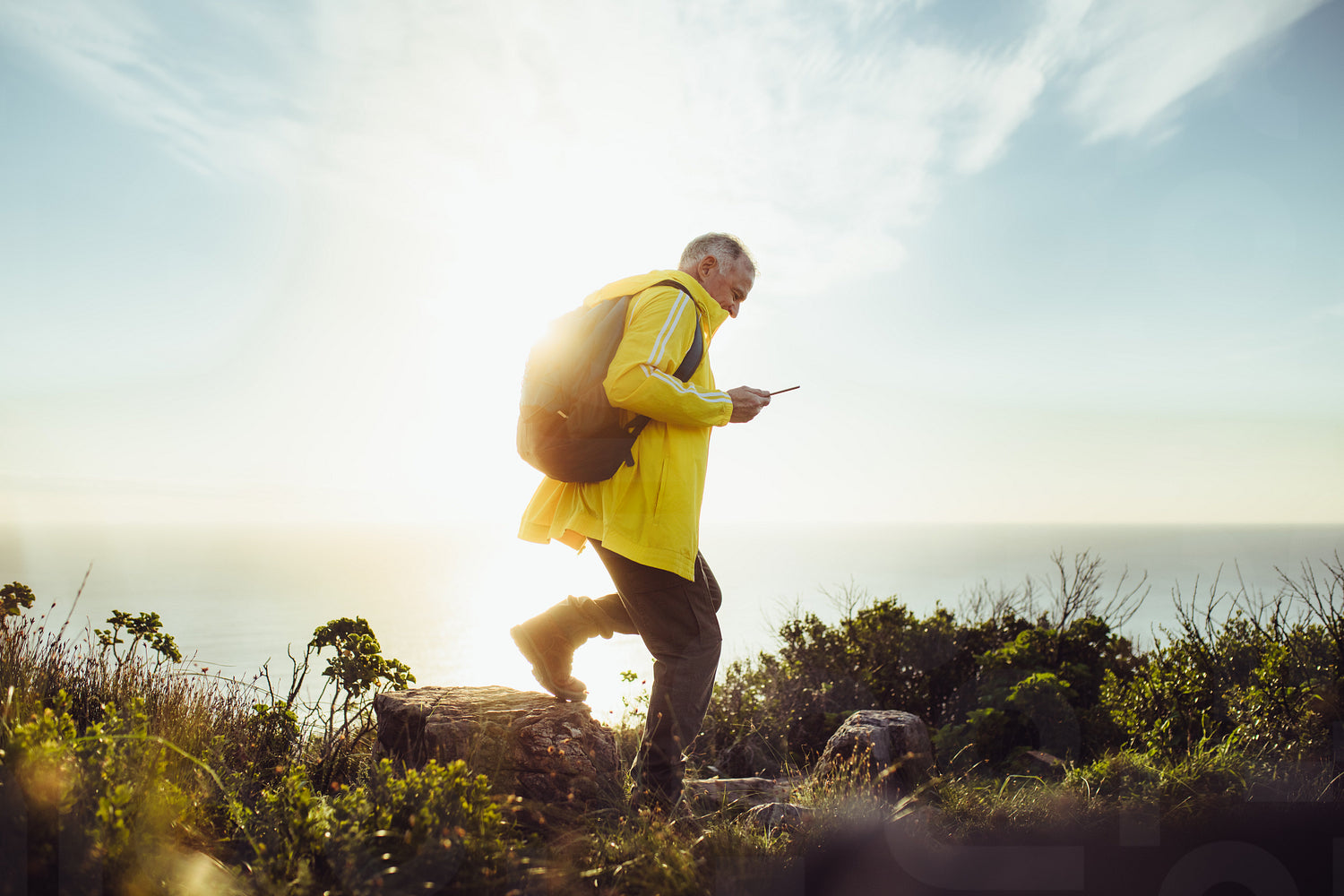 Side view of a man wearing backpack walking on a rocky hill. Senior man hiking on a hill looking at his mobile phone with sun in the background.