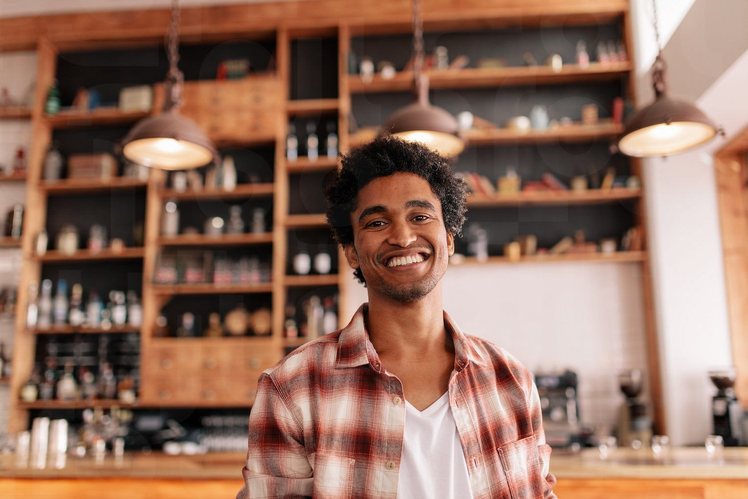Portrait of happy young man standing in a cafe bar. Handsome young guy in a coffee shop.