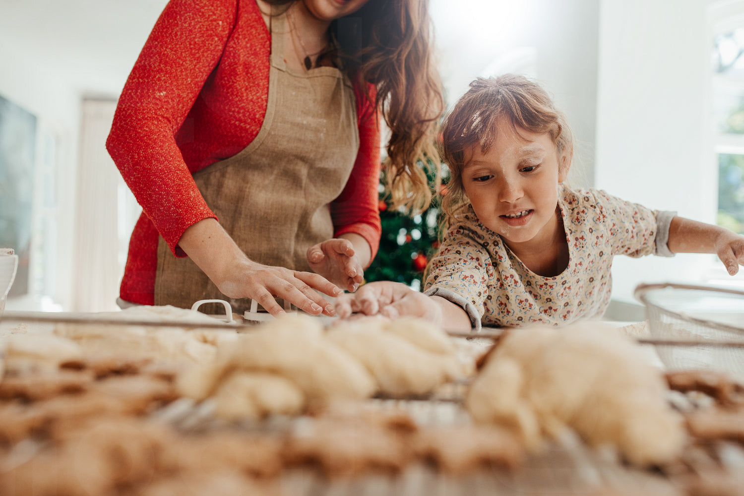 Mother and child making Christmas cookies. Daughter placing cookie dough on baking tray while mother cutting cookies with cutter.