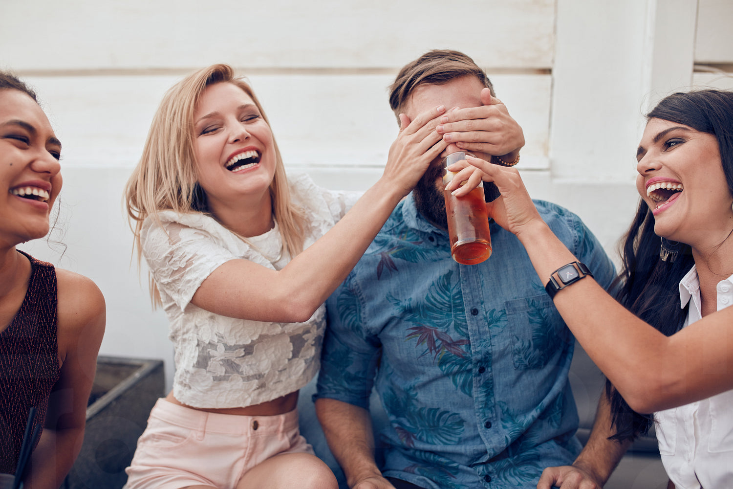 Shot of young people sitting together enjoying party. Woman closing eyes of a man with another giving drink. Young friends having fun at party.