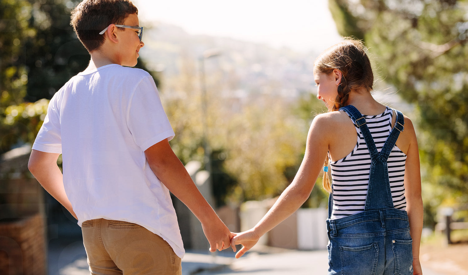 Smiling boy and girl spending time together walking on street outdoors. Boy and girl standing in street and talking holding hand.