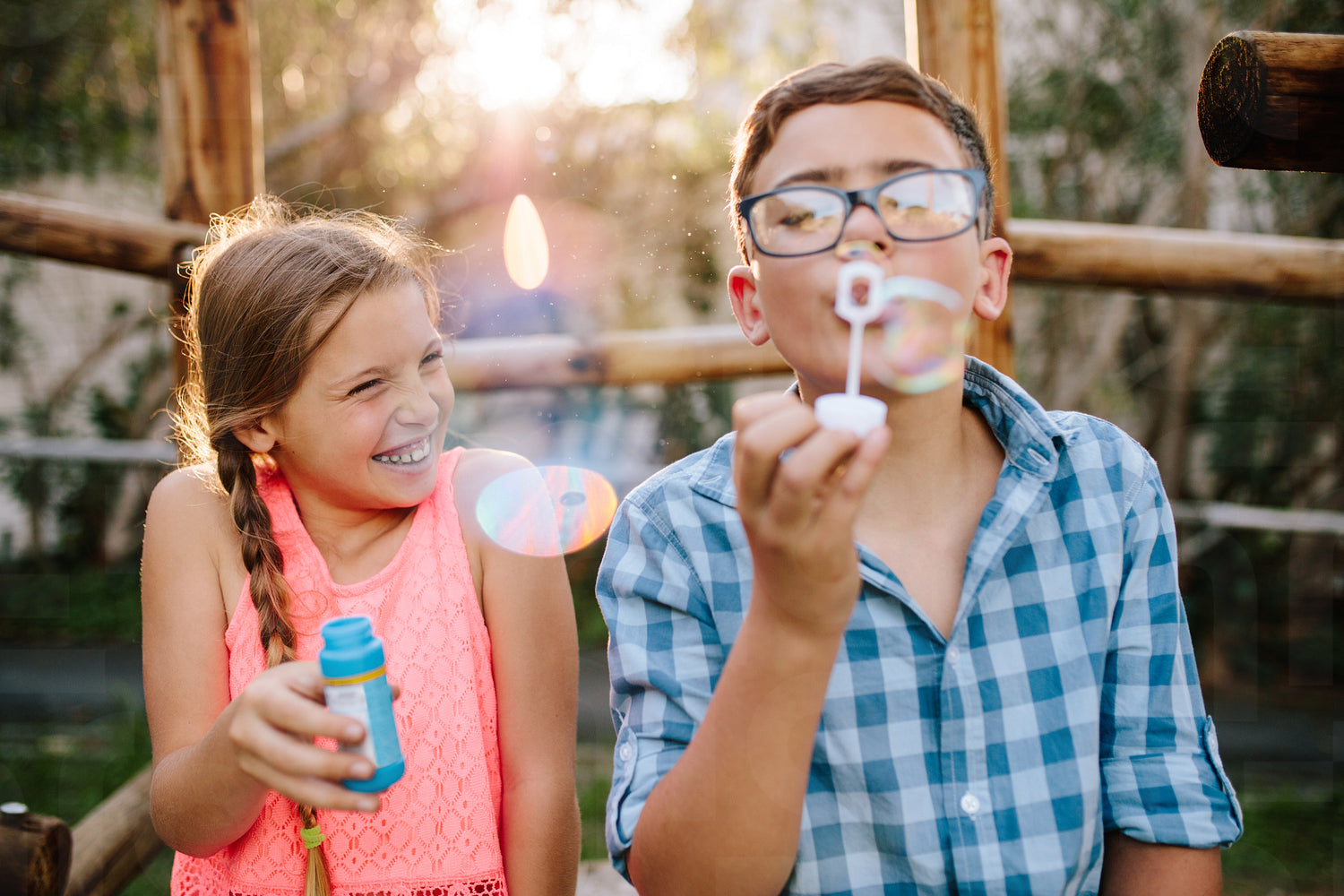 Boy blowing soap bubbles while an excited girl enjoys the bubbles. Happy teenage boy and girl in a park enjoying making soap bubbles.