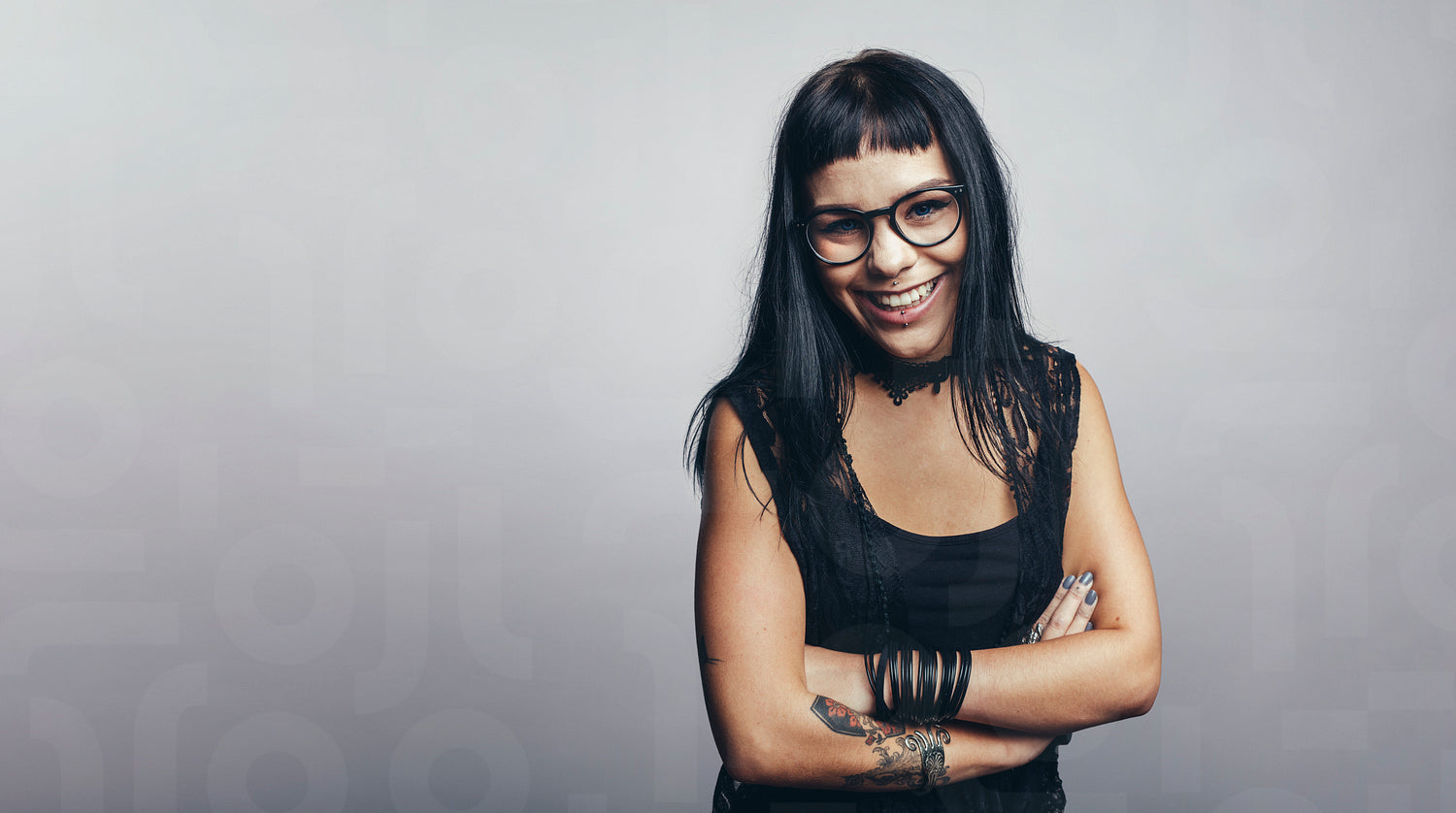 Smiling gothic woman with fashion piercing on lips isolated on grey background. Portrait of smiling young woman with tattoo on hand looking at camera.
