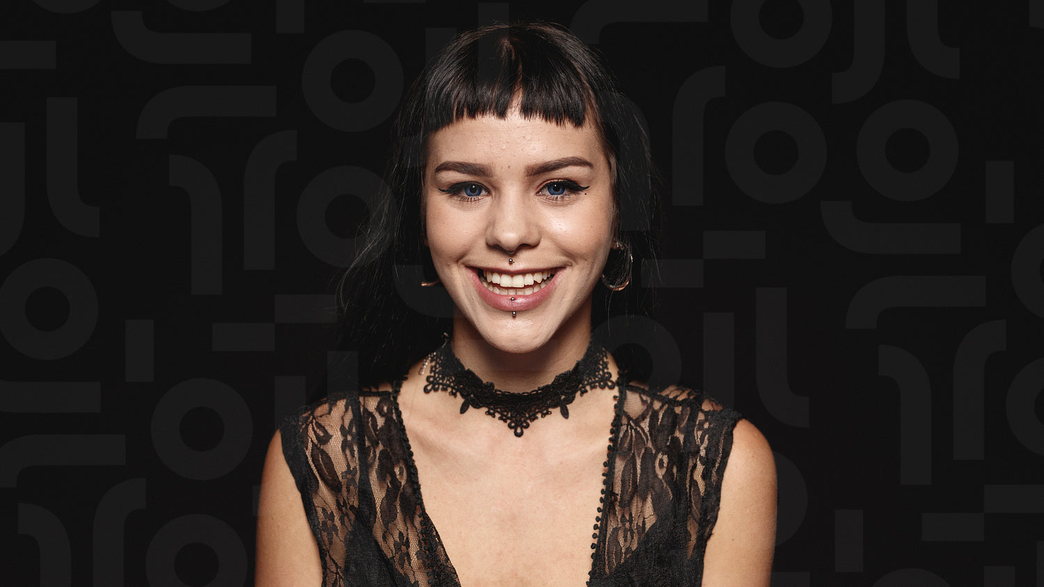 Smiling woman with fashion piercing on lips isolated on black background. Portrait of a young gothic woman looking at camera.