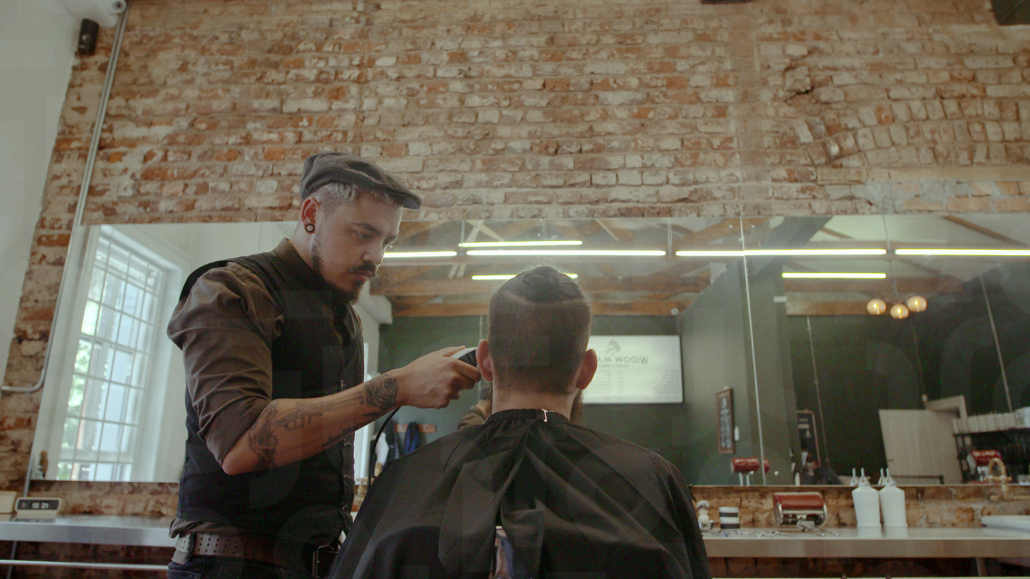 Barber giving a trendy haircut to client. Hairstylist trimming hair of customer with electric trimmer at salon.