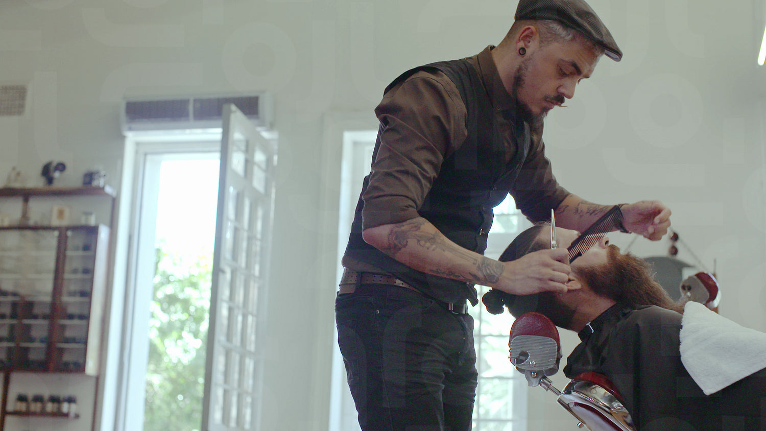 Client getting beard trimmed in barber shop. Stylish hairdresser trimming beard of customer at salon.