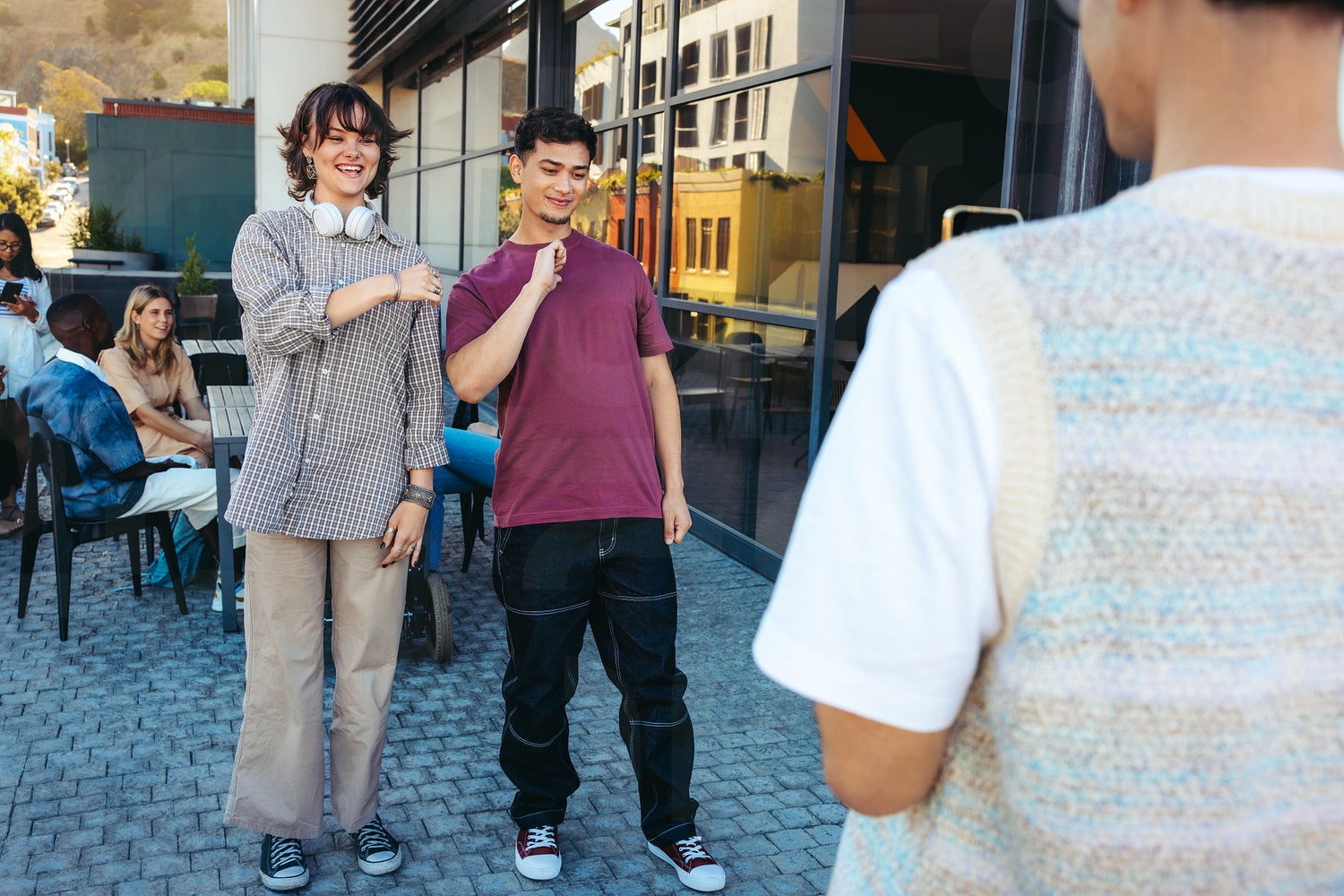 Young students enjoying a dance practice session, capturing fun moments for social media. Group of friends rehearsing outdoors in a lively, casual urban environment.