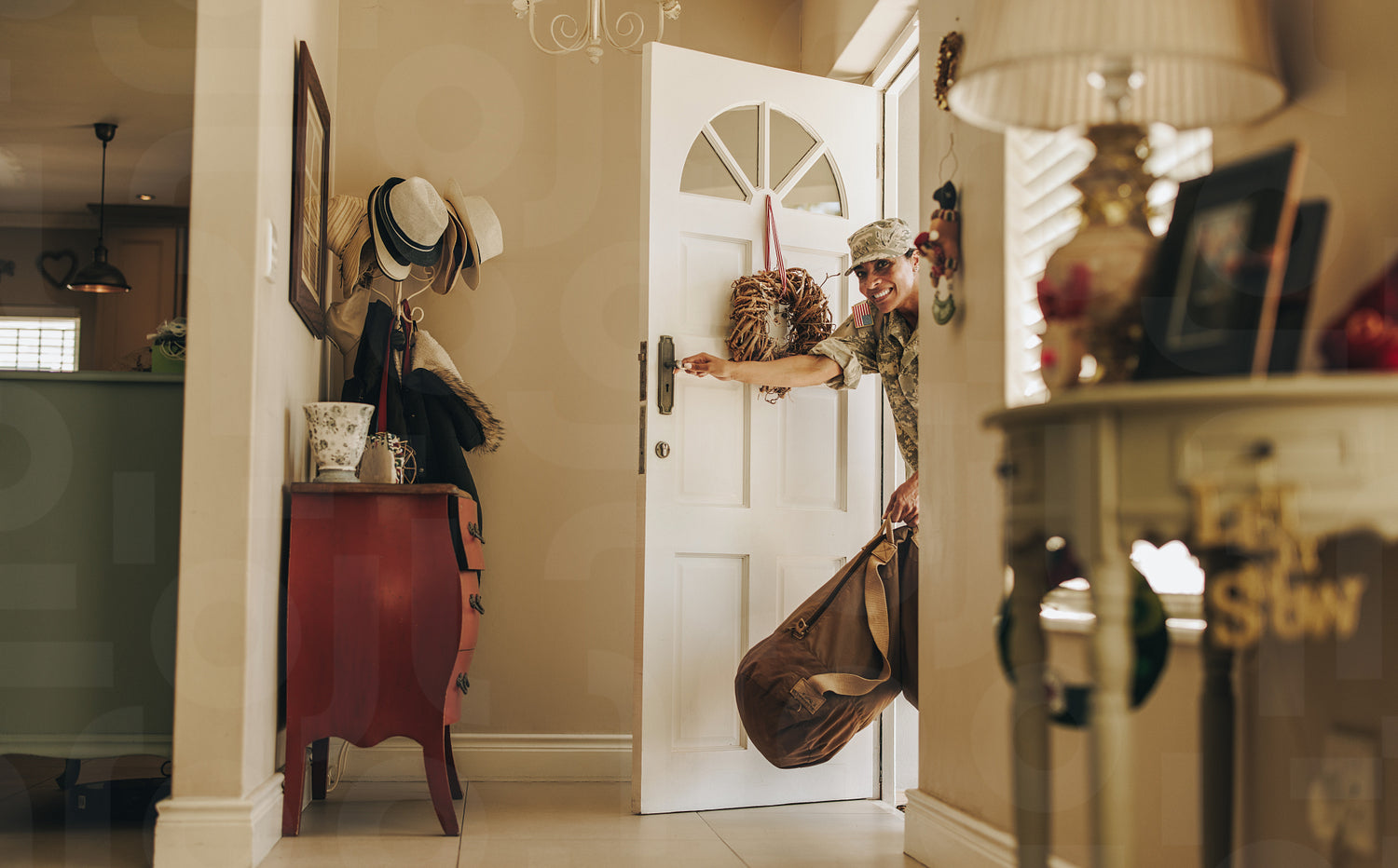 Happy female soldier smiling cheerfully while entering her home with her luggage. Patriotic American servicewoman making a surprise homecoming after serving her country in the military.
