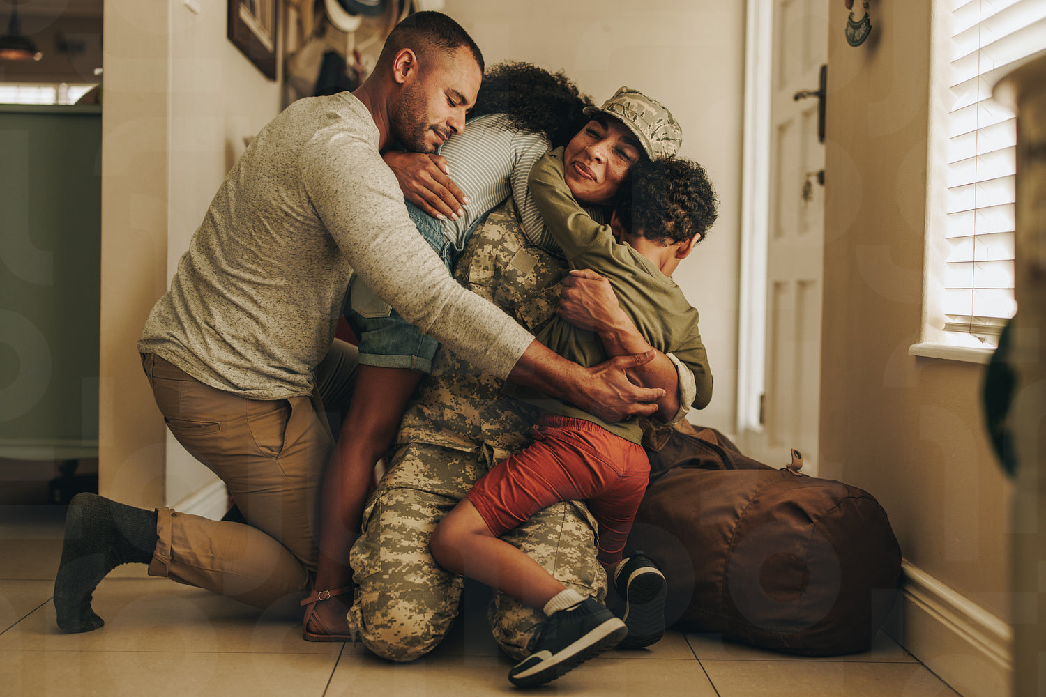 Happy military homecoming. Female soldier reuniting with her husband and children after serving in the army. Cheerful servicewoman embracing her family after returning home from deployment.
