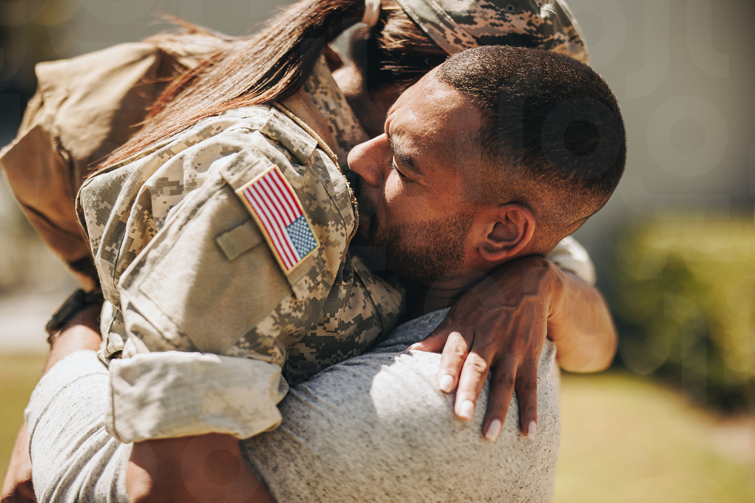 Heartwarming military homecoming. Female soldier embracing her husband after returning home from the army. American servicewoman reuniting with her husband after serving her country in the military.