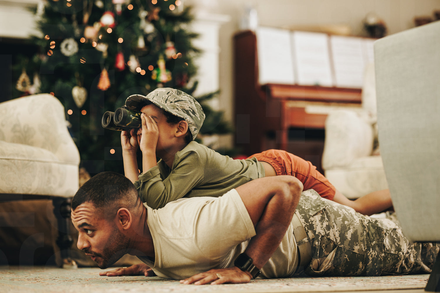 Military dad spending some quality time with his son at Christmas. Army soldier spending the holidays with his child after deployment. Father and son enjoying playtime during their reunion.