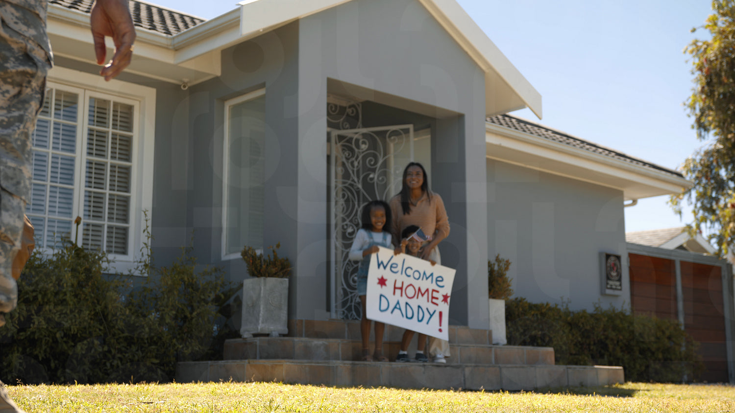 American soldier returns home to a warm welcome from his wife and two kids after deployment, he arrives to a loving homecoming sign and an affectionate family hug. Patriotic Marine reunites with his family.
