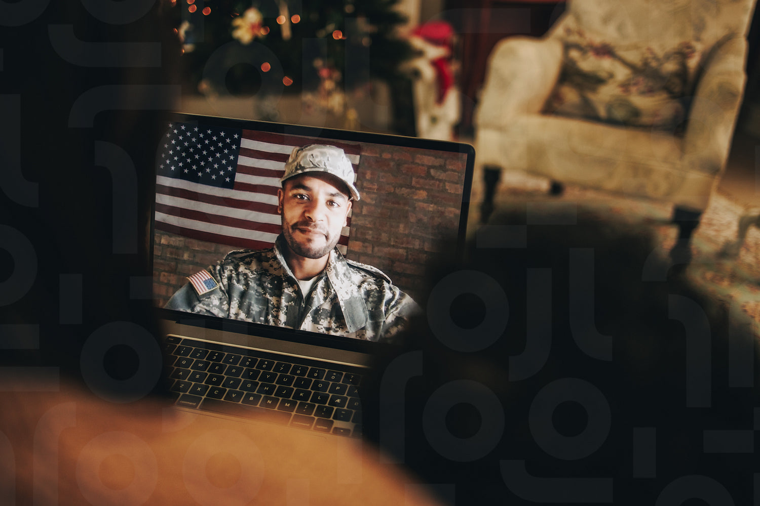 Military man video calling his family at Christmas. American soldier communicating with his family on a laptop. Military family having an online holiday celebration.