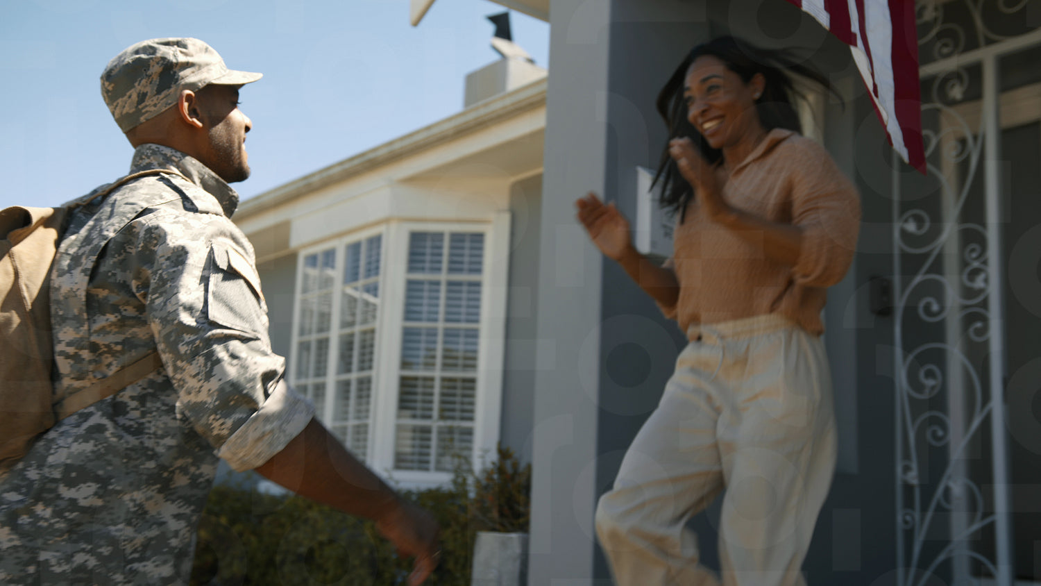 Excited military wife reunites with her husband on his surprise homecoming. Woman jumping to embrace her husband in his camouflage attire, giving him a warm welcome home after his deployment in the US Army.