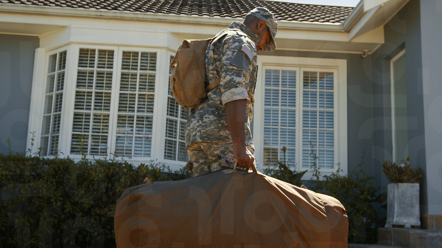 Young male soldier makes his way to his home upon his return from the US Army, carrying a backpack and a military bag. Patriotic young man coming back to his family after a committed service in the military.
