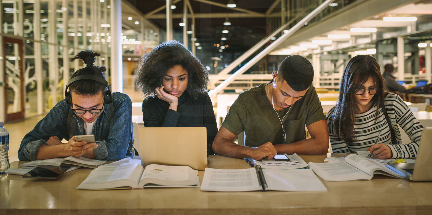 Multi-ethnic students sitting at college library. Students using making notes, using laptop and mobile phones while studying together.