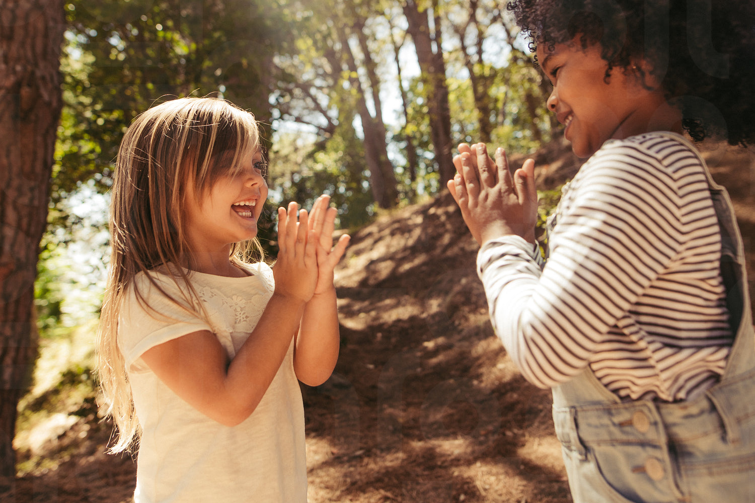 Cute girls playing clapping games outdoors. Children playing games in forest.