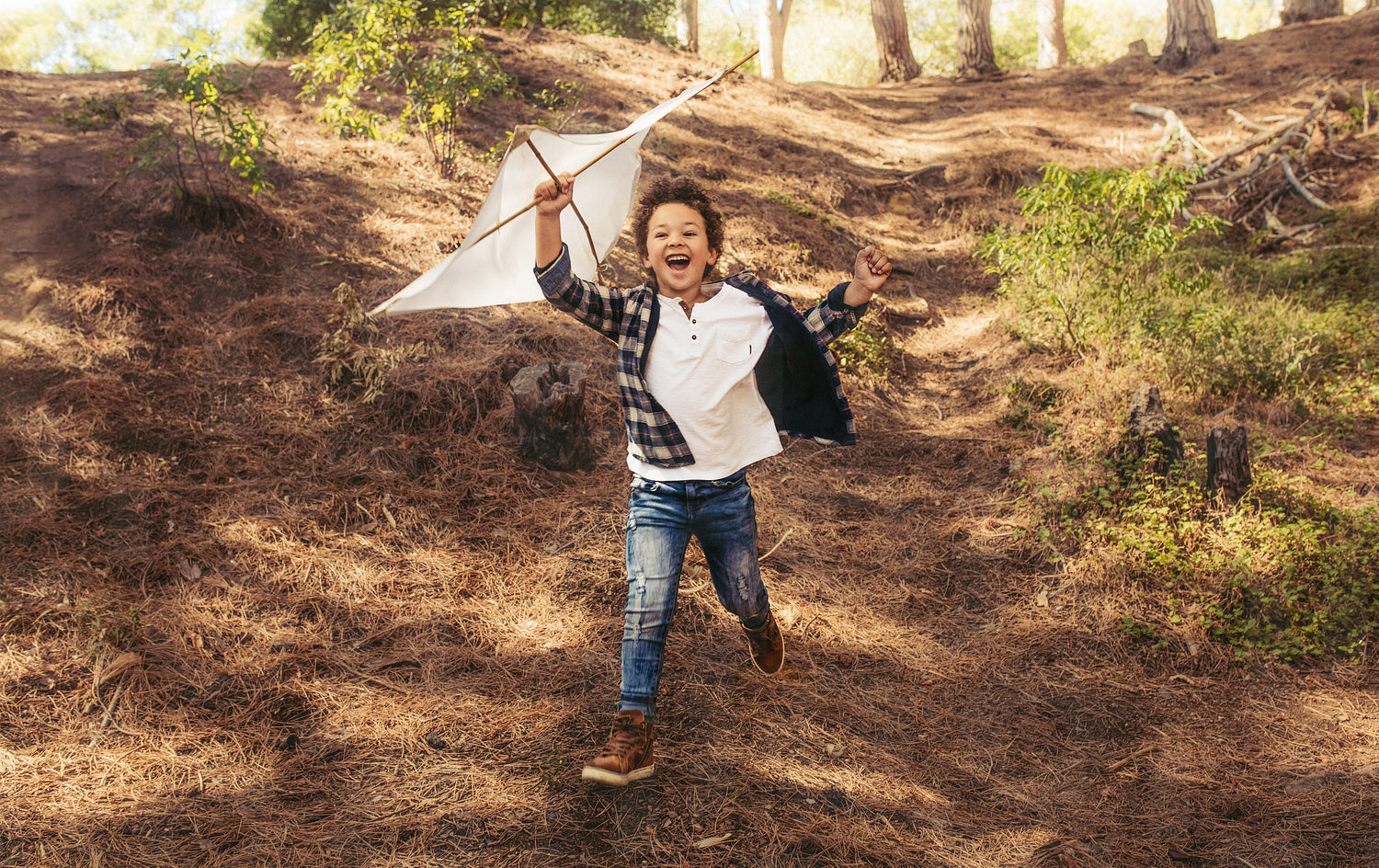 Happy boy running with a kite in hands over his head. Excited boy playing with a kite in forest.