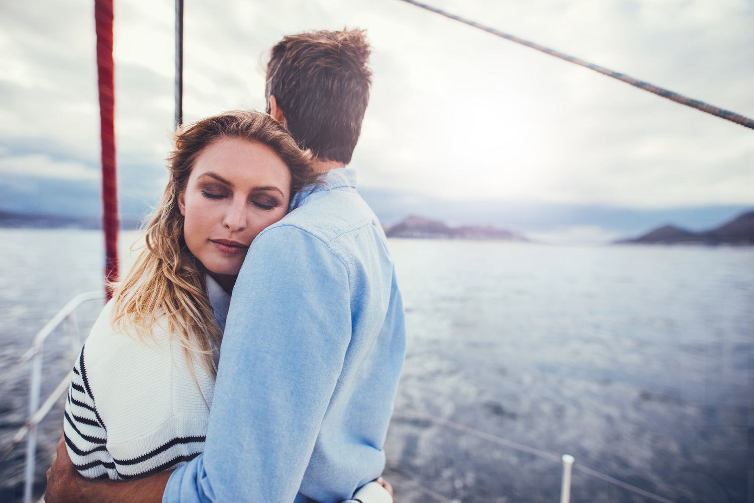 Affectionate couple in romantic getaway on a yacht