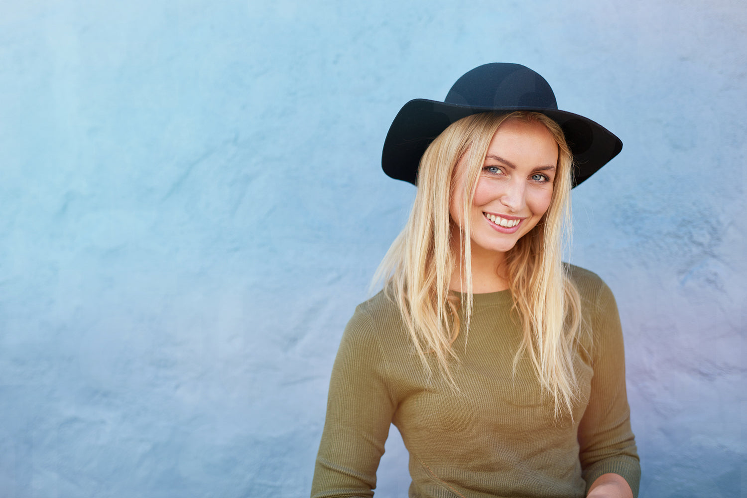Horizontal shot of smiling young female wearing hat looking at camera and smiling. Attractive young female model standing in front of a blue wall.
