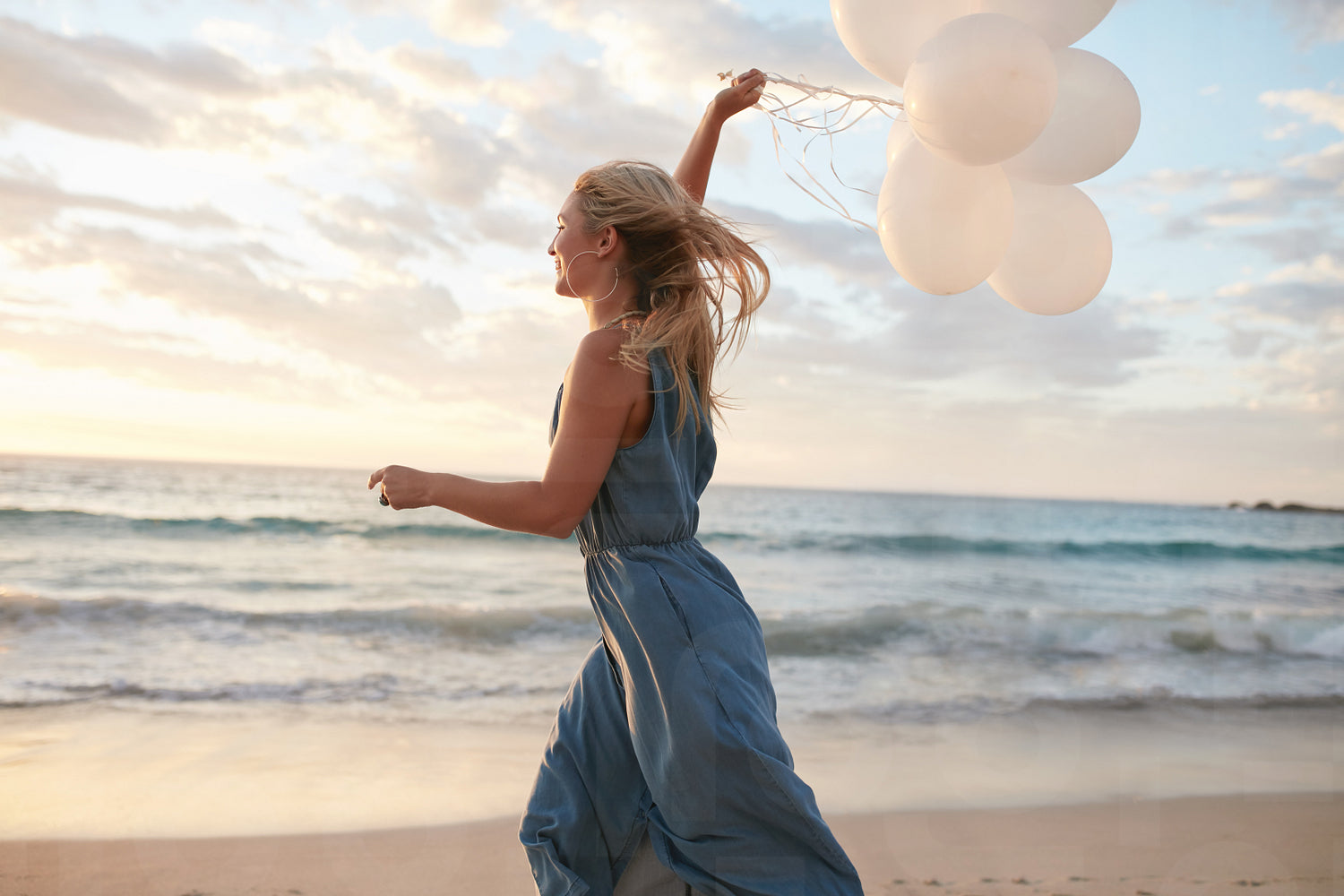 Side view shot of beautiful young woman running on the beach holding balloons. Female running on the sea shore and having fun.