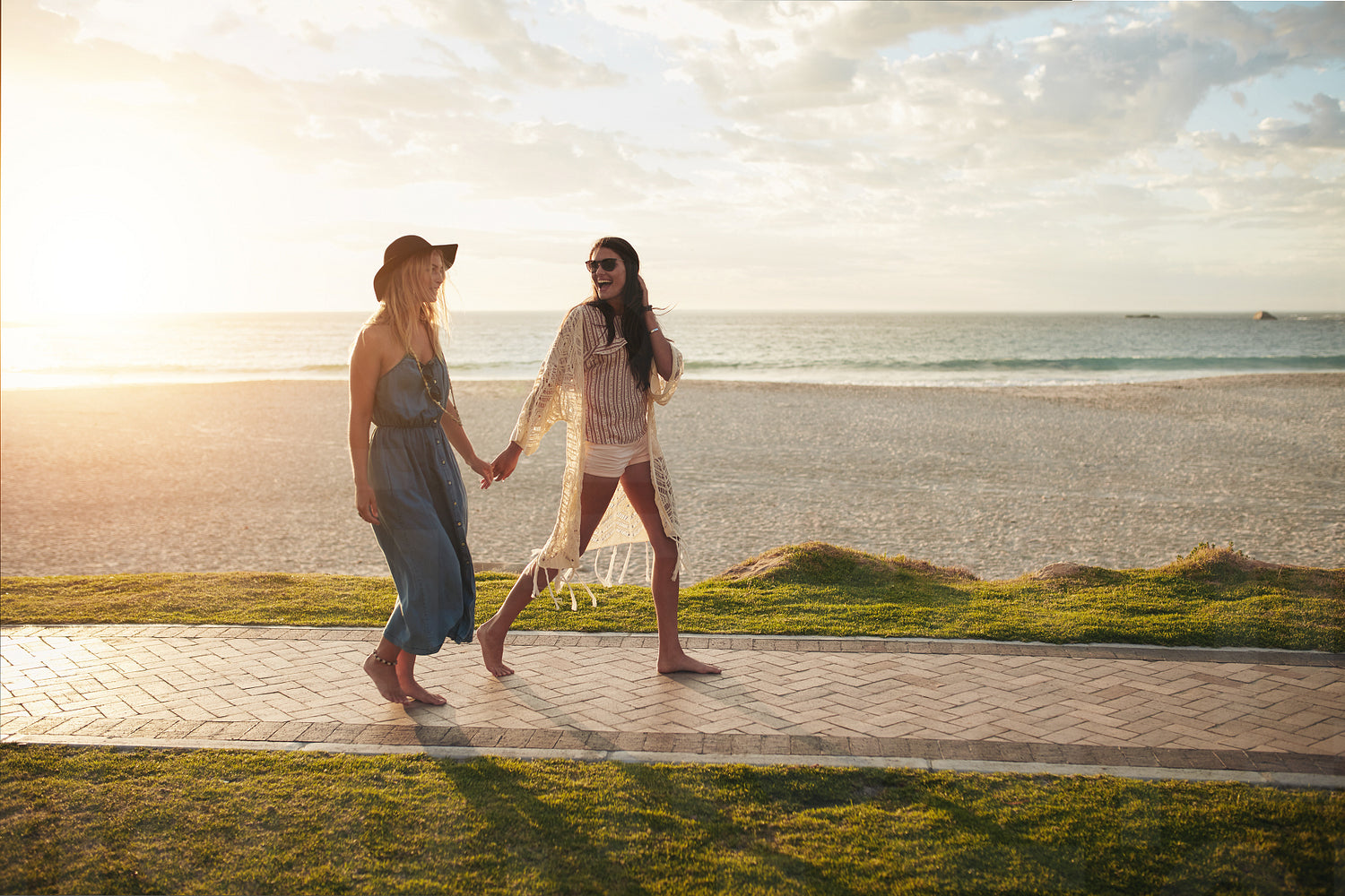 Full length shot of two young women walking on a sidewalk along a beach on summer day. Best friends on a beach vacation.