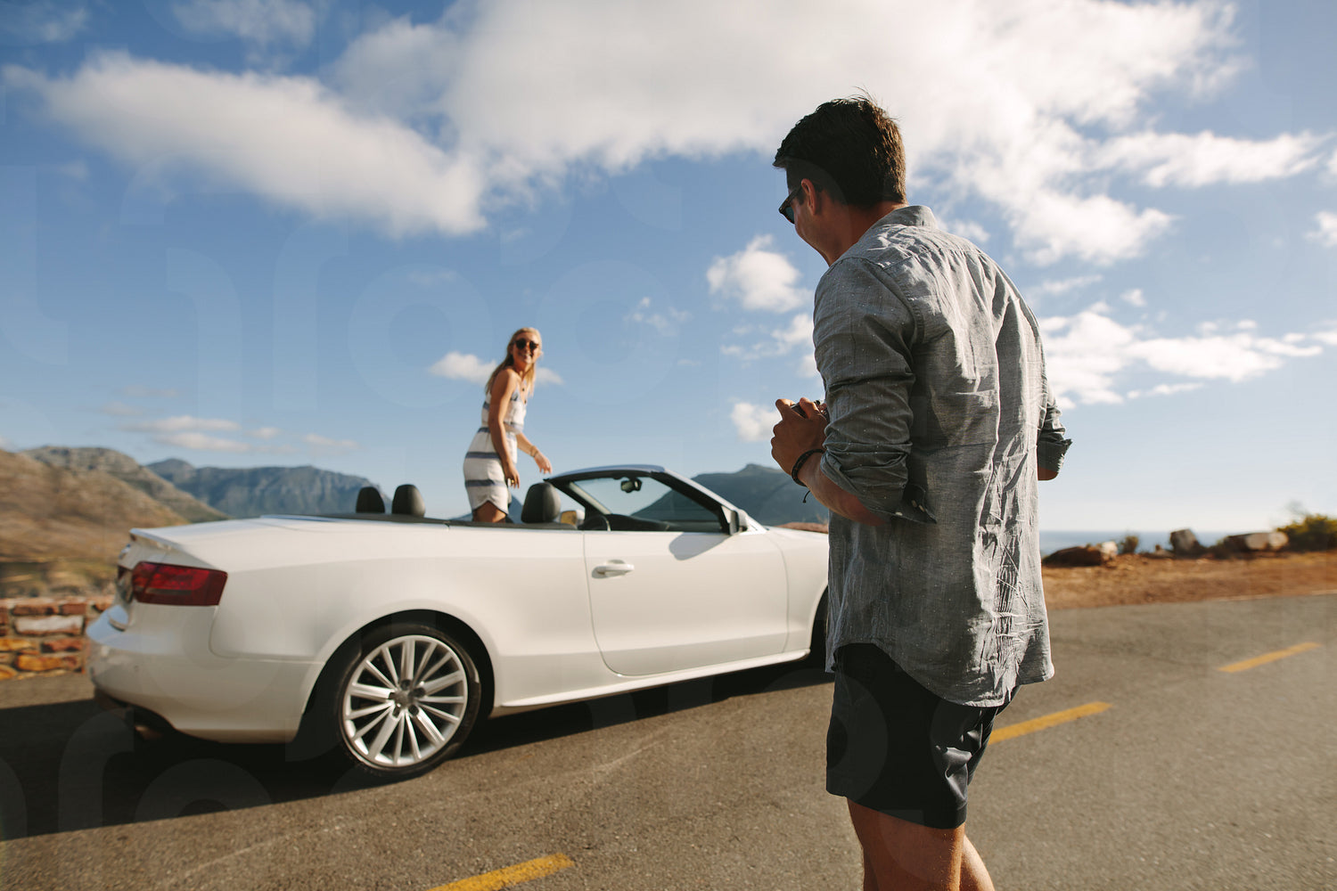 Man with camera on the highway with woman standing inside a open car. Couple having a photo shoot on their road trip.
