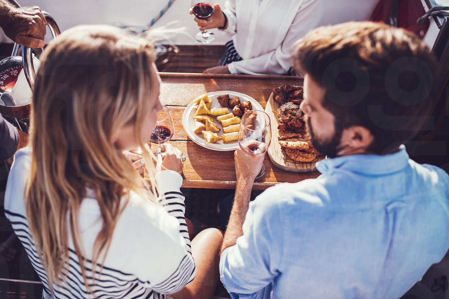 Top view shot of young people having food and drink on a boat. Group of friends having a small party on the boat.