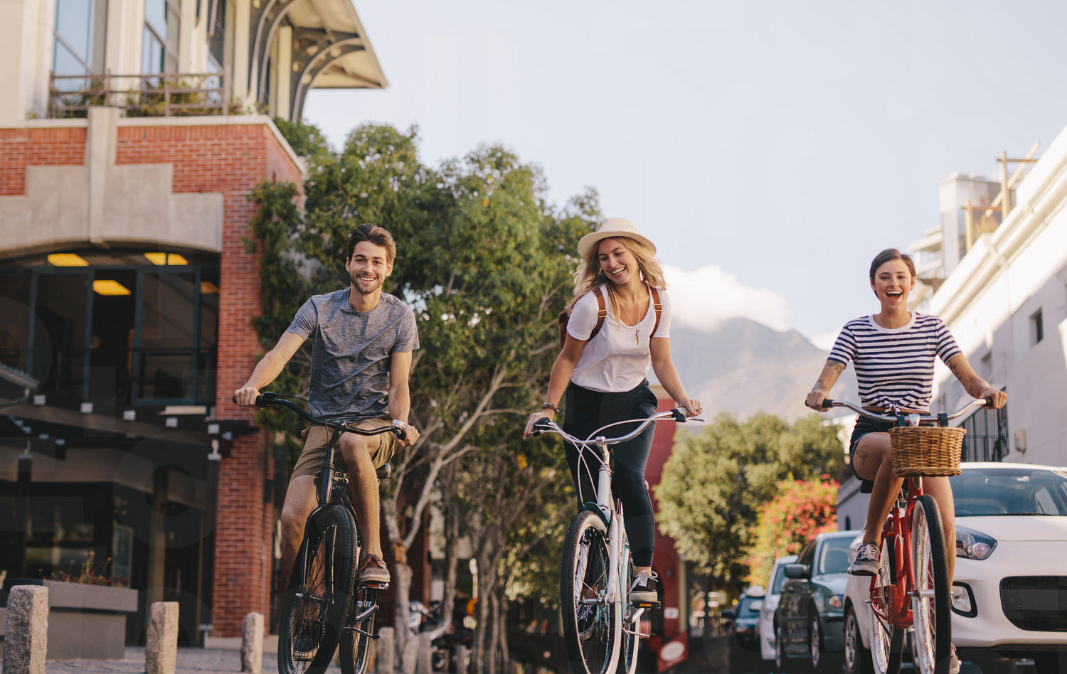 Group of friends cycling in the city