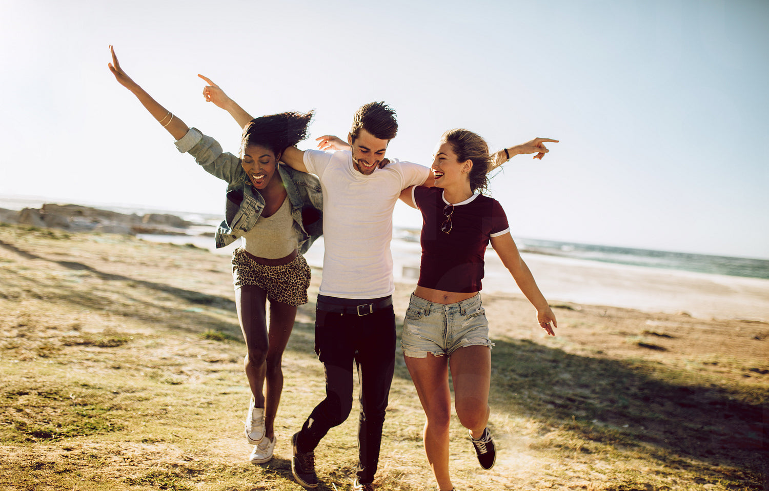 Group of three young friends running together with their arms outstretched. Young man and women enjoying a summer day outdoors.